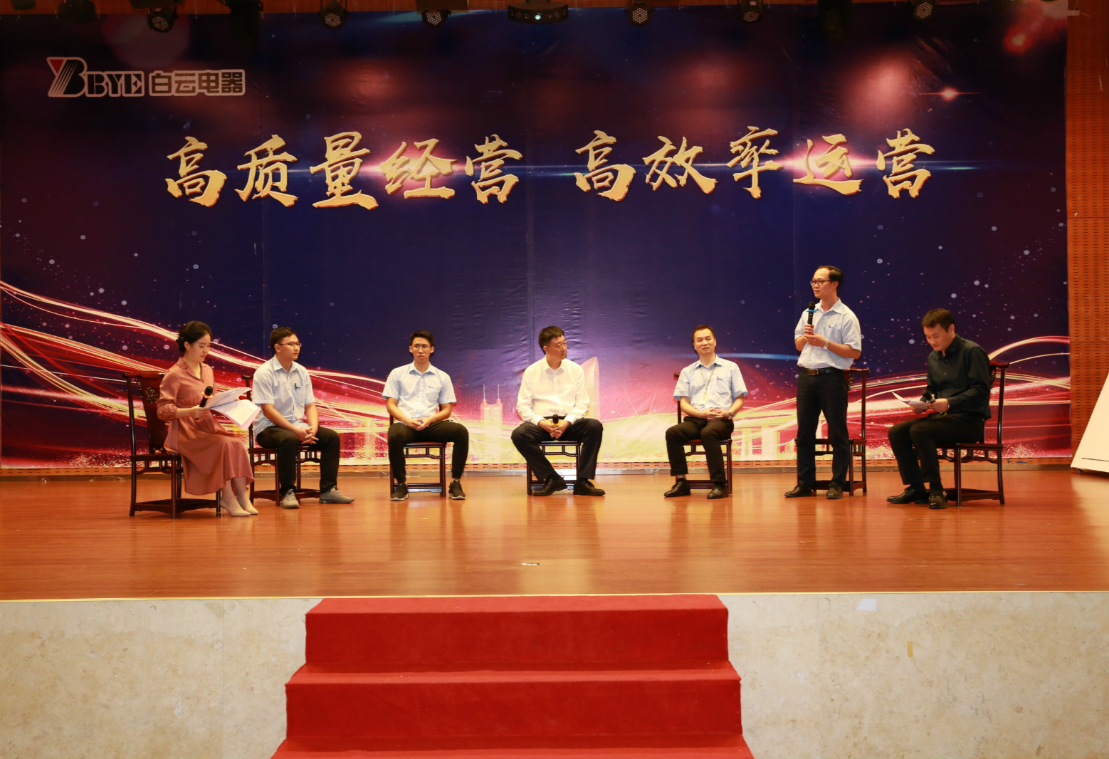 奮戰(zhàn)三百天,使命必達(dá),目標(biāo)必達(dá)!在全場(chǎng)熱烈的矚目下,白云電器領(lǐng)導(dǎo)班子、施耐德專家以及所有項(xiàng)目組成員,共同上臺(tái)啟動(dòng)白云電器精益項(xiàng)目。啟動(dòng)人員在全場(chǎng)激昂的倒計(jì)時(shí)聲中共同拉下啟動(dòng)拉桿,畫軸緩緩展開“攜手共創(chuàng) 精益白云”八個(gè)大字,標(biāo)志著白云電器精益生產(chǎn)正式起航!